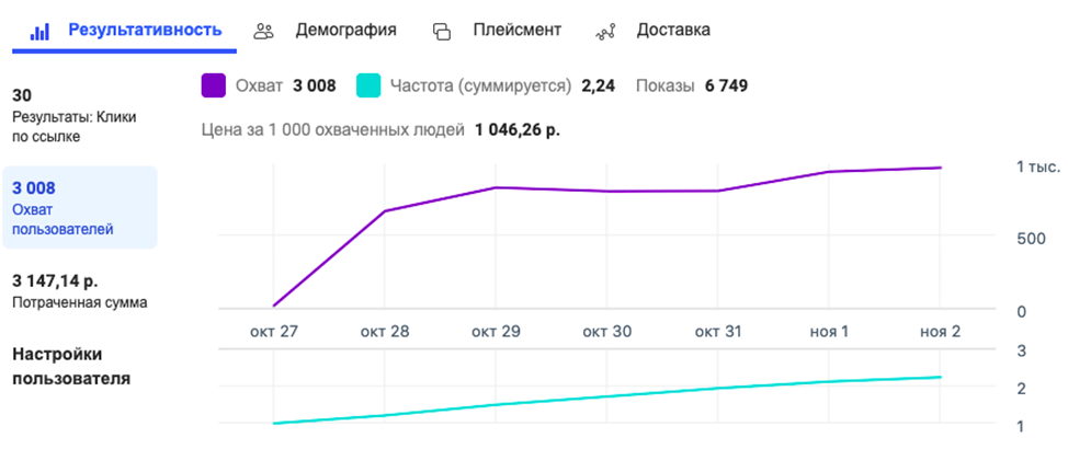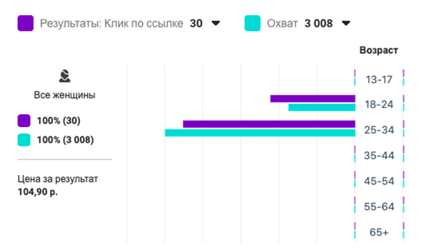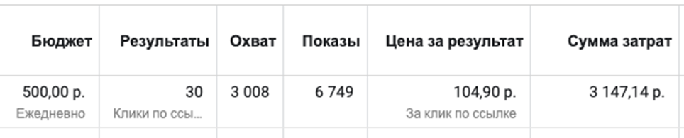 По сути было 30 переходов на сайт из 3000 людей, увидевших рекламу. Цена за клик довольно высокая - 105 рублей практически.